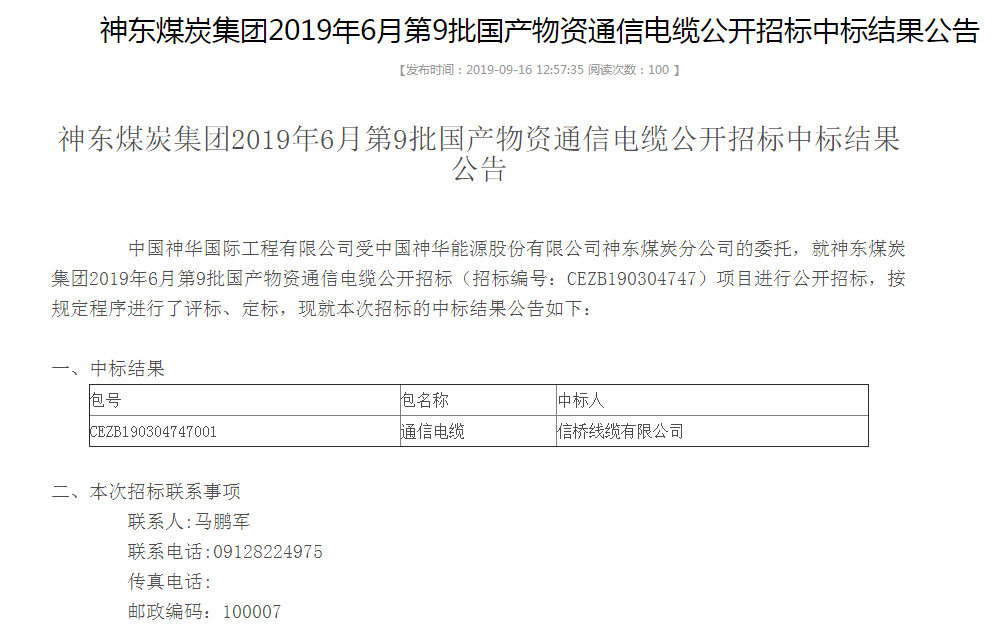 點擊數:67362019-11-21 00:00:00 來源: 神東煤炭集團2019年6月第9批國產物資通信電纜公開招標中標結果公告